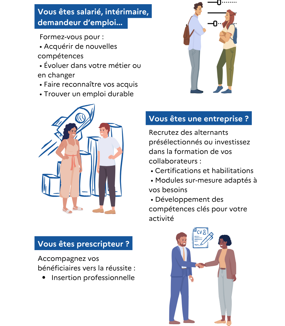 Notre réseau travaille en étroite collaboration avec le monde économique pour moderniser ses formations et prestations et mieux anticiper les évolutions technologiques et organisationnelles qui impactent et impacteront les métiers d’aujourd’hui et de demain.